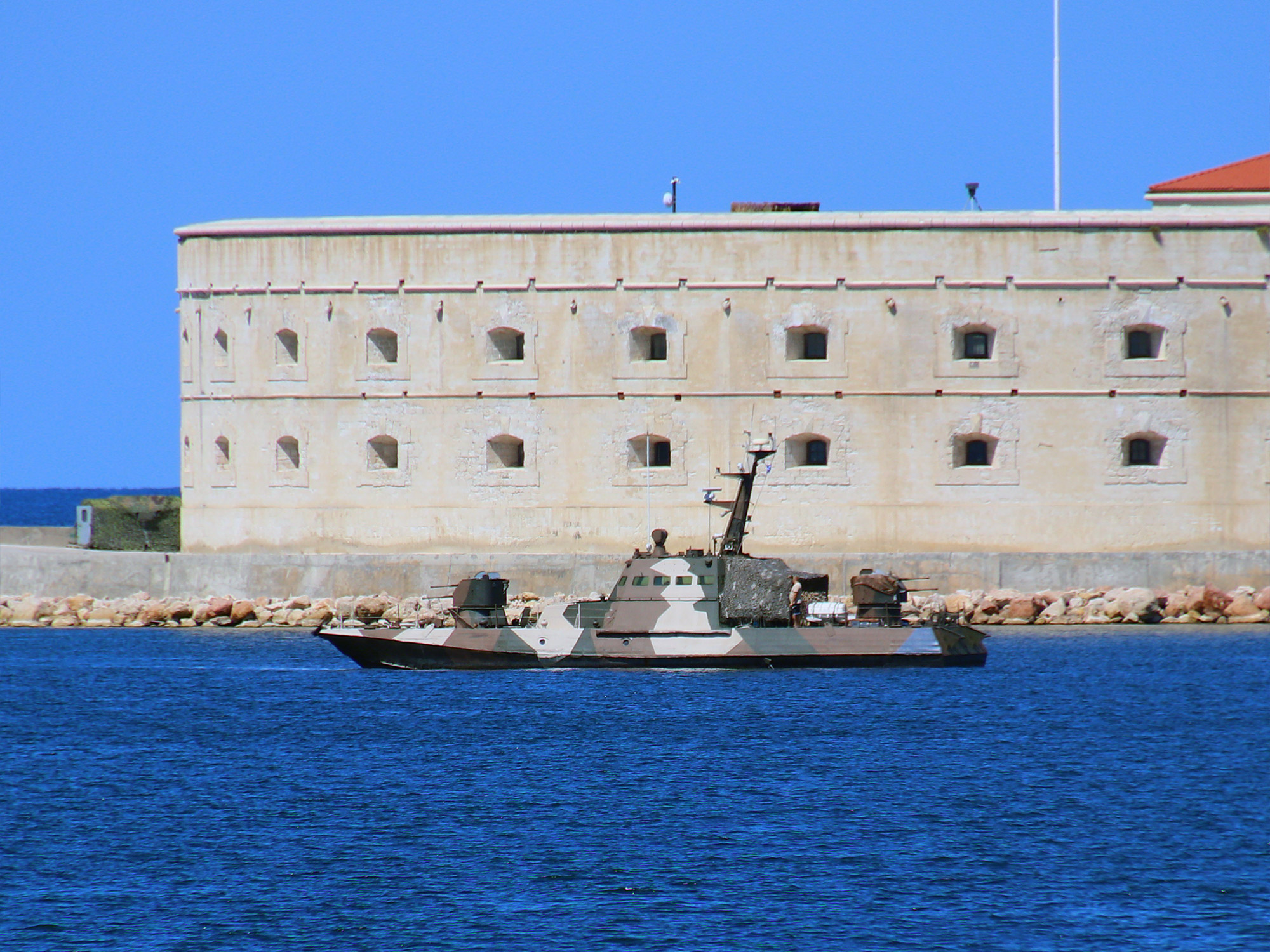 Артиллерийский катер "Разбойник" ЧФ РФ на фоне Константиновской батареи в Севастополе (фото А.Бричевский, 21 августа 2025 г.)