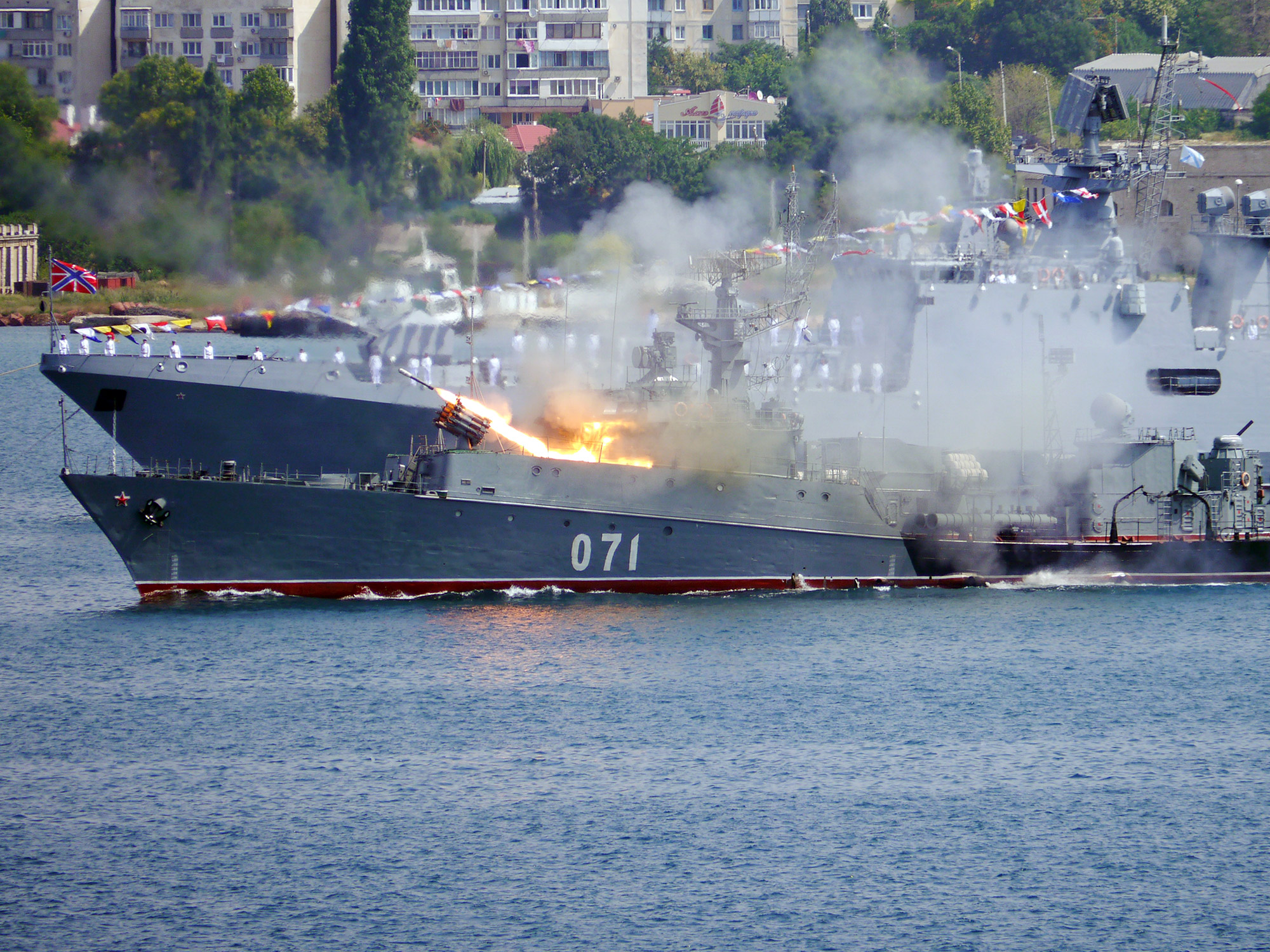 Пуск глубинной бомбы с РБУ-6000 на МПК "Суздалец" Черноморского флота (фото А.Бричевский, 27 июля 2017 г.)