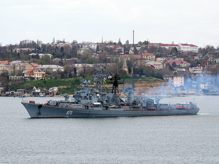Сторожевой корабль "Сметливый" на фоне Северной стороны Севастополя (фото А.Бричевский