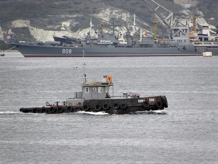 Буксирный катер "БУК-533" на фоне СКР "Пытливый" (фото