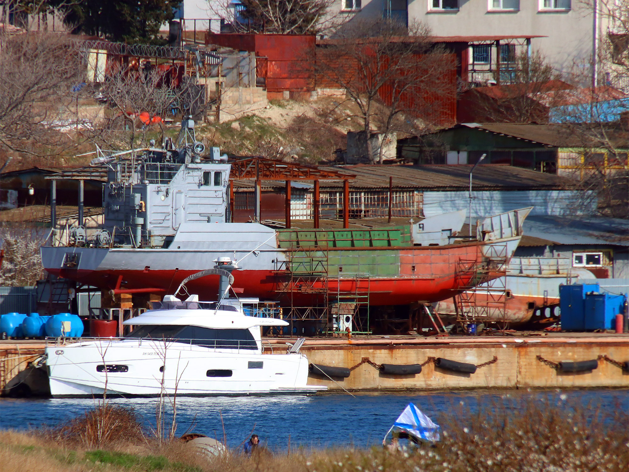 Стыковка кормовой части десантного катера Д-106 и его аппарели с вновь изготовленной средней частью корпуса (фото А.Бричевский, 19 марта 2023 г.)