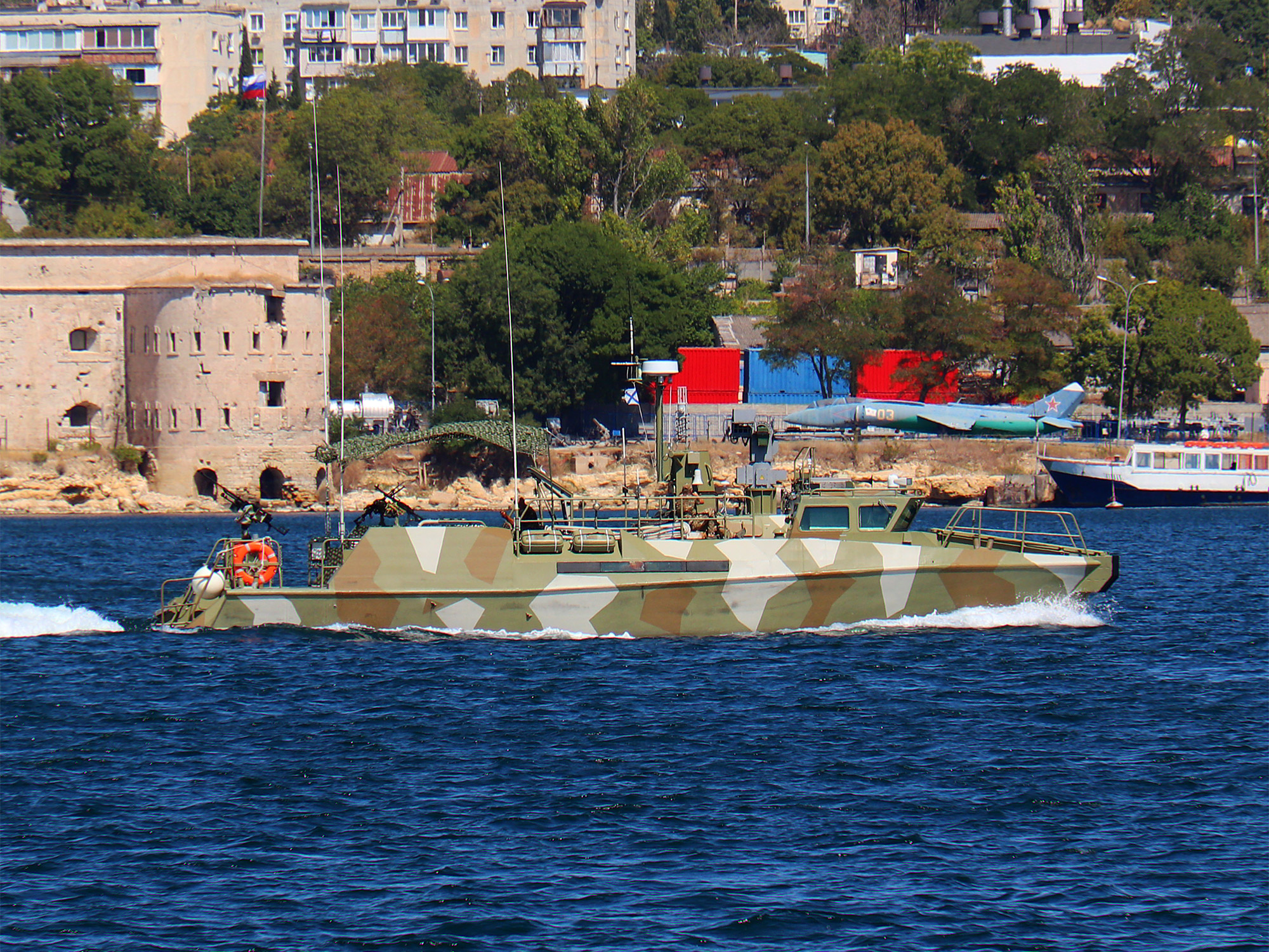 Противодиверсионный катер "Евгений Колесников" БФ РФ типа "Раптор" в Севастопольской бухте (фото А.Бричевский, 28 августа 2025 г.)