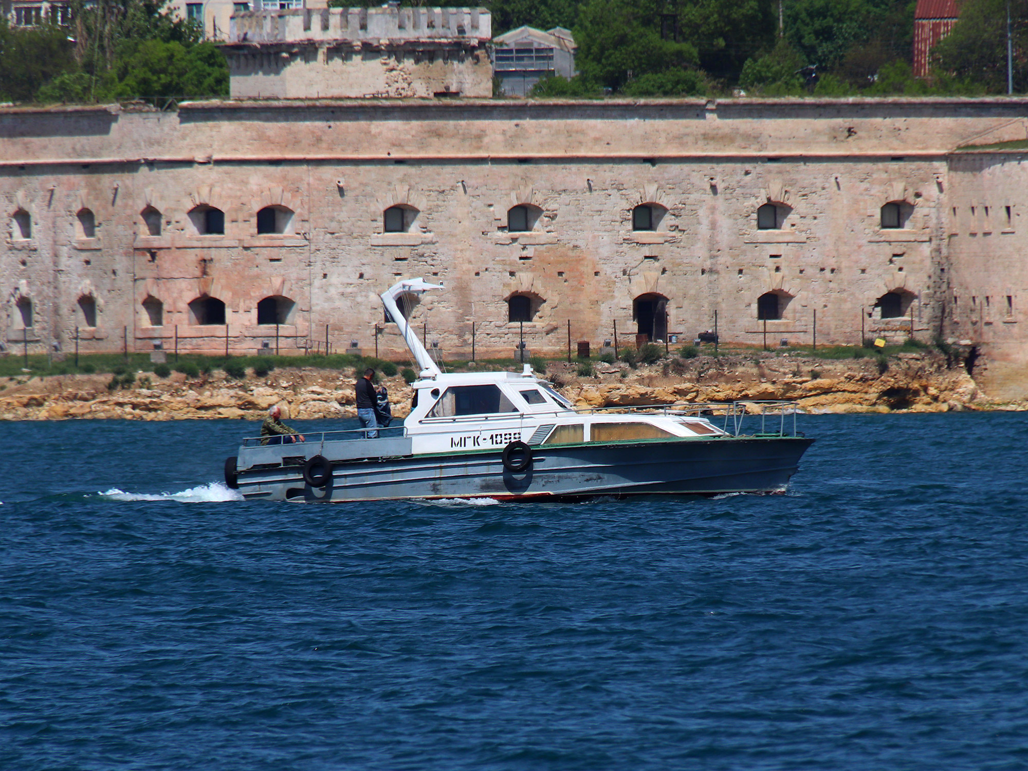 Малый гидрографический катер МГК-1099 на фоне Михайловской батареи, Севастополь (фото А.Бричевский, 18 апреля 2024 г.)