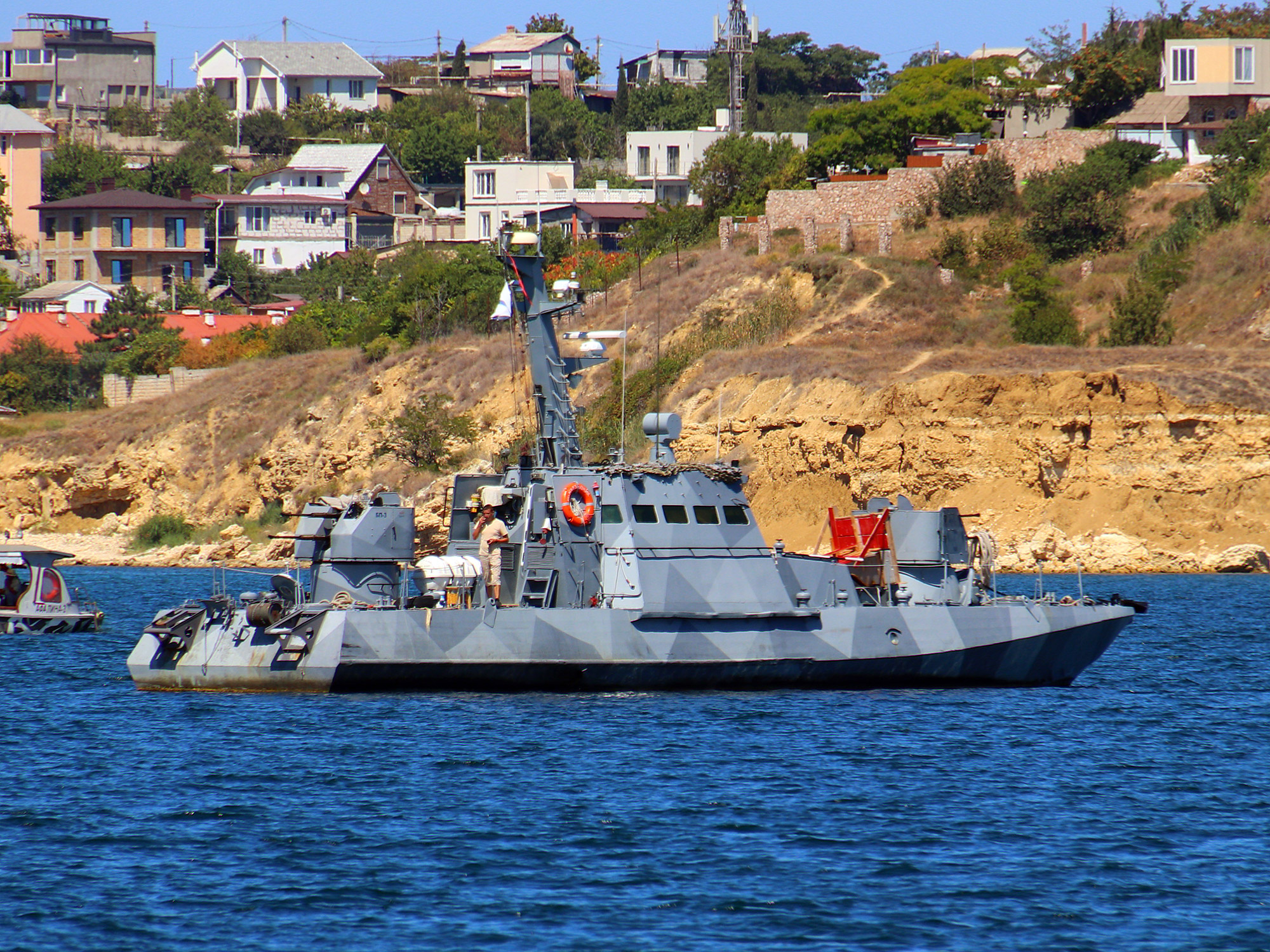 Артиллерийский катер "Наездник" Черноморского флота на фоне Севреной стороны Севастополя (фото А.Бричевский, 21 августа 2025 г.)