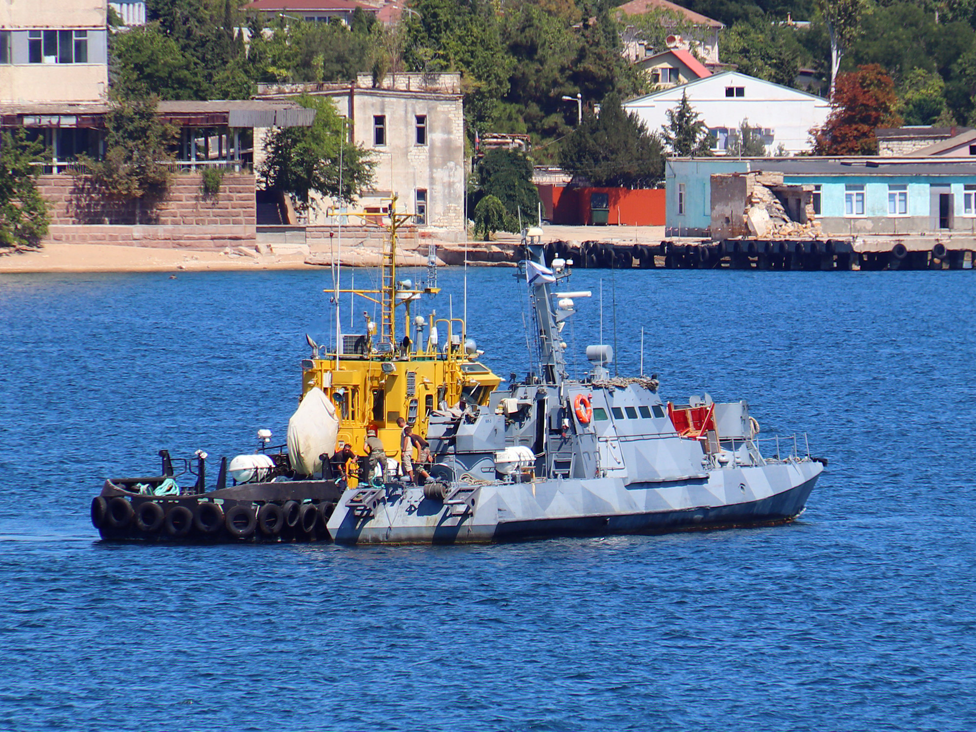 Артиллерийский катер "Наездник" Черноморского флота и рейдовый буксир в бухте Севастополя (фото А.Бричевский, 21 августа 2025 г.)