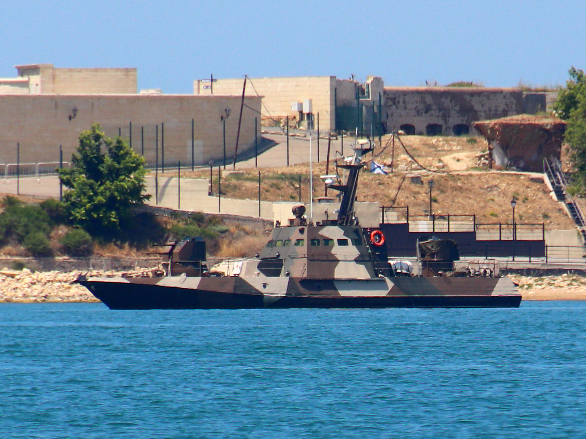 Артиллерийский катер "Разбойник" ЧФ РФ на фоне Северной стороны в Севастополе (фото А.Бричевский, 17 июня 2025 г.)