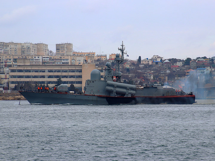 Ракетный катер "Набережные Челны" Черноморского флота на фоне Северной стороны Севастополя (фото А.Бричевский, 01 февраля 2023 г.)