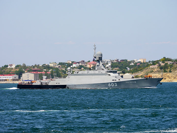 Малый ракетный корабль "Серпухов" на фоне Северной стороны Севастополя (фото А.Бричевский, 25 июля 2016 г.)
