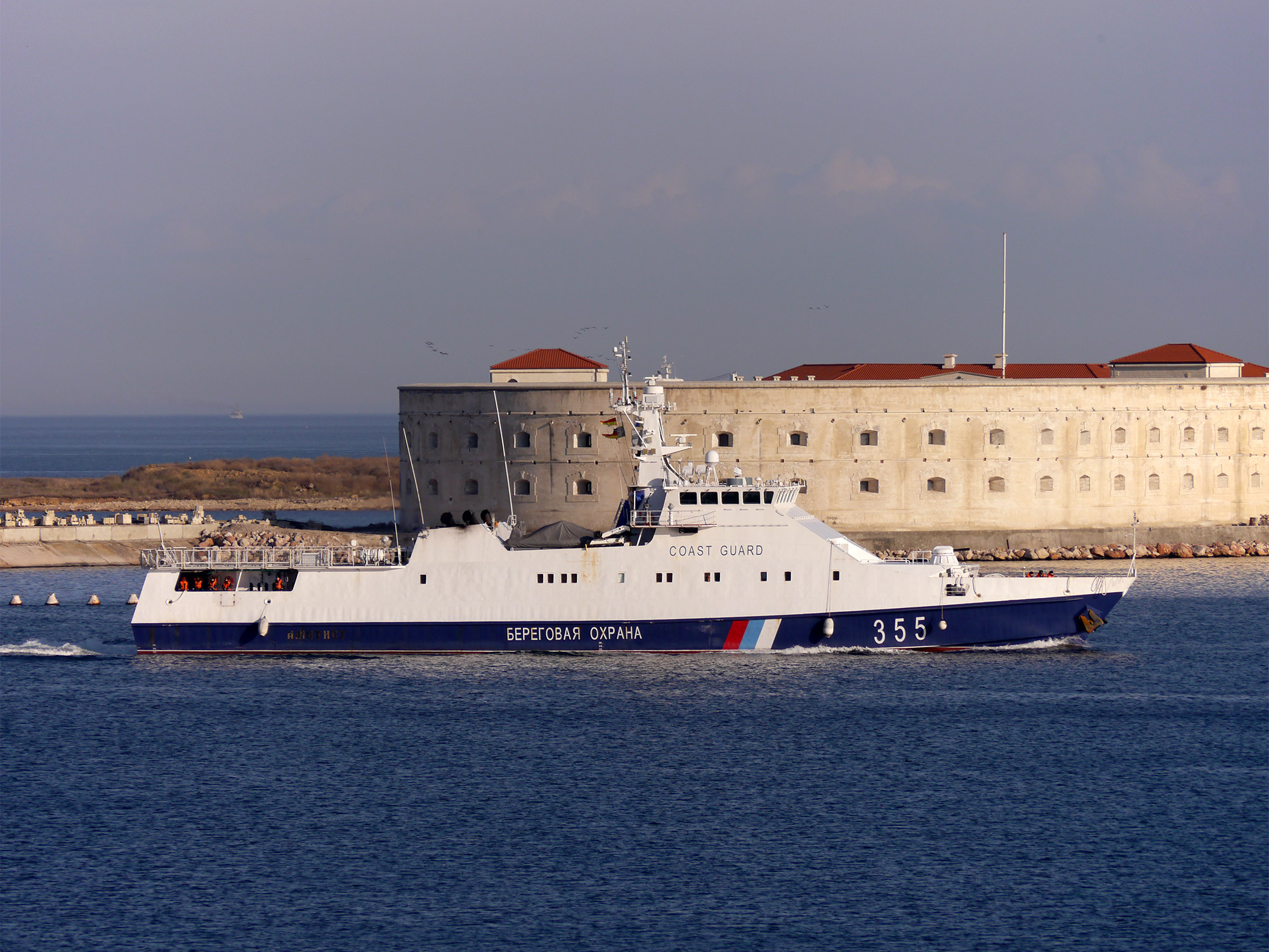 Пограничный сторожевой корабль "Аметист" на фоне Константиновской батареи, Севастополь (фото А.Бричевский, 15 февраля 2018 г.)