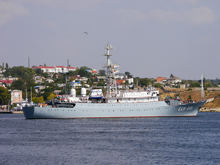 Разведывательный корабль "Приазовье" на фоне Северной стороны Севастополя (фото А.Бричевский, 22 сентября 2015 г.)