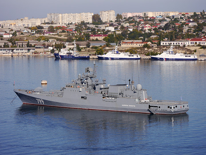 Фрегат "Адмирал Макаров" на фоне пограничных кораблей (фото А.Бричевский, 11 октября 2018 г.)