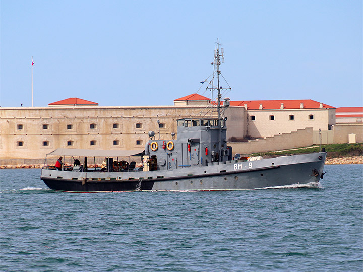 Водолазное морское судно ВМ-9 ЧФ РФ на фоне Константиновской батареи, Севастополь (фото А.Бричевский, 03 апреля 2024 г.)