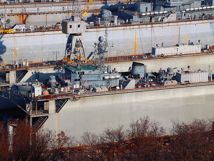 Морской тральщик "Иван Голубец" Черноморского флота России в плавдоке (фото А.Бричевский, 30 ноября 2022 г.)