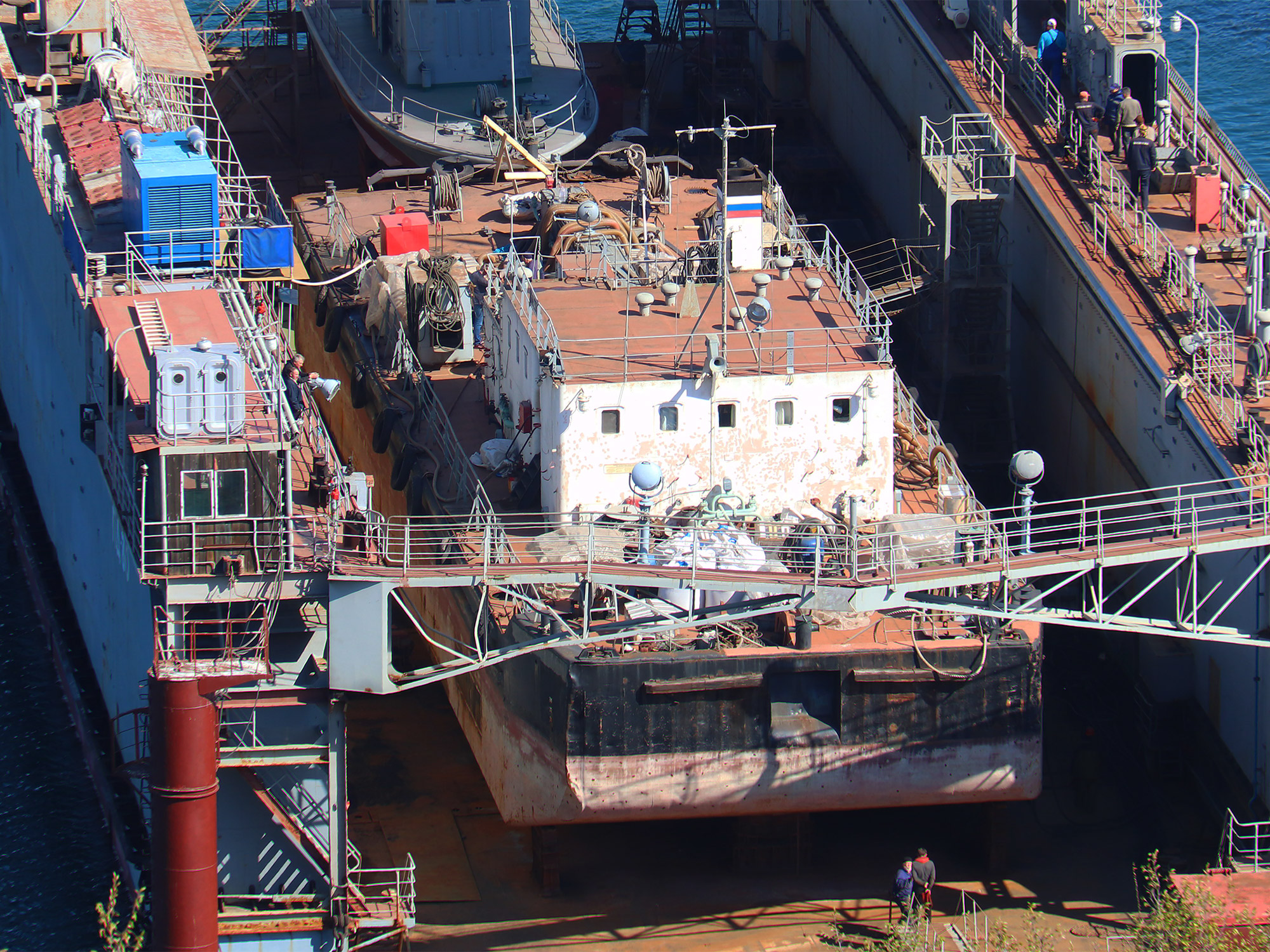Рейдовая несамоходная наливная баржа БНН-226800 ЧФ РФ в плавучем доке (фото А.Бричевский, 14 апреля 2023 г.)