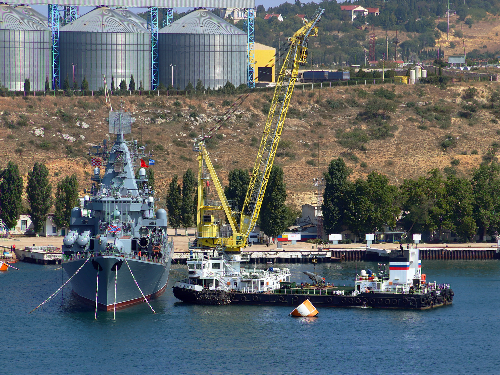 Самоходный плавучий кран СПК-46150 на погрузке ПКР "Вулкан" на ракетный крейсер (фото А.Бричевский, 10 июня 2021 г.)